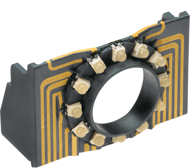 The 3D-MID module aligns the individual LEDs precisely to ensure full illumination of the area to be secured. The connection of the LEDs to the main circuit board is already integrated in the MID solution and thus drastically reduces the installation effort.